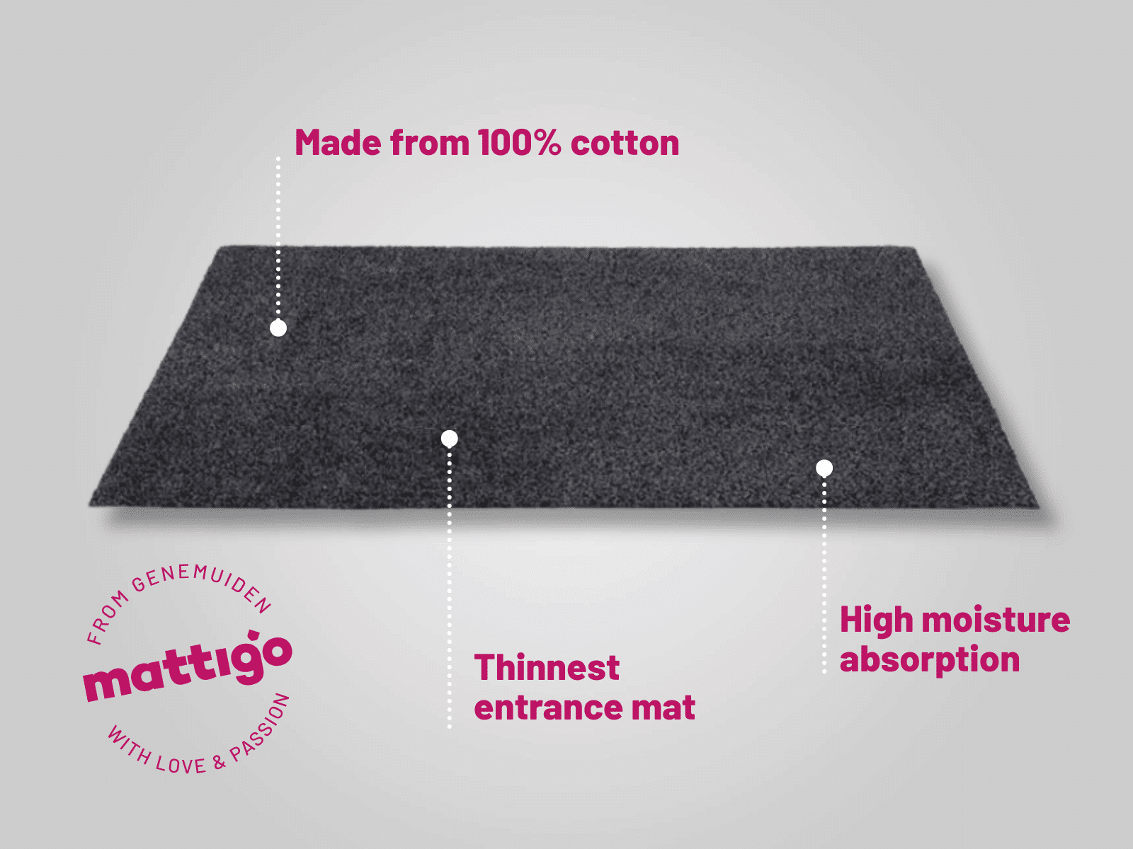 The Cotton 5mm doormat is designed with a cotton surface bonded to a slip-resistant vinyl backing. This extra thin doormat has a high level of moisture absorption and fits under every door. The Cotton is available in multiple colors and can be ordered in any size. The mat is not finished with rubber borders.