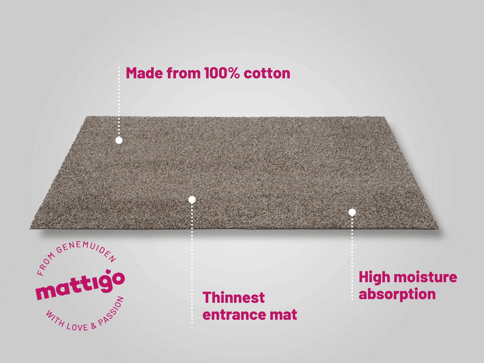 The Cotton 5mm doormat is designed with a cotton surface bonded to a slip-resistant vinyl backing. This extra thin doormat has a high level of moisture absorption and fits under every door. The Cotton is available in multiple colors and can be ordered in any size. The mat is not finished with rubber borders.